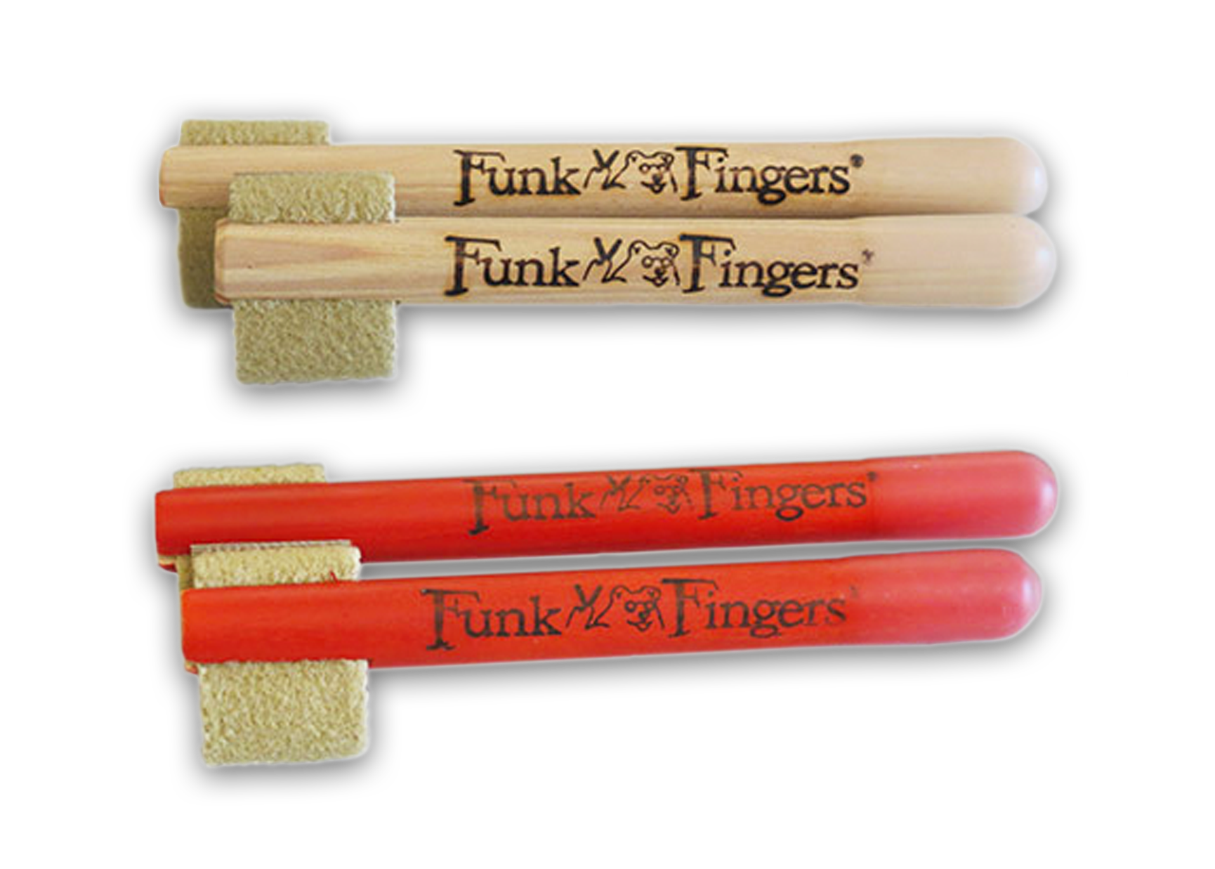Funk Fingers were created by bassist Tony Levin and his guitar technician, Andy Moore. The sticks strap onto the first and second fingers and are used to achieve percussive sounds. They are length-compensated for the difference in finger length and feature a stretch strap to attach to your fingers.